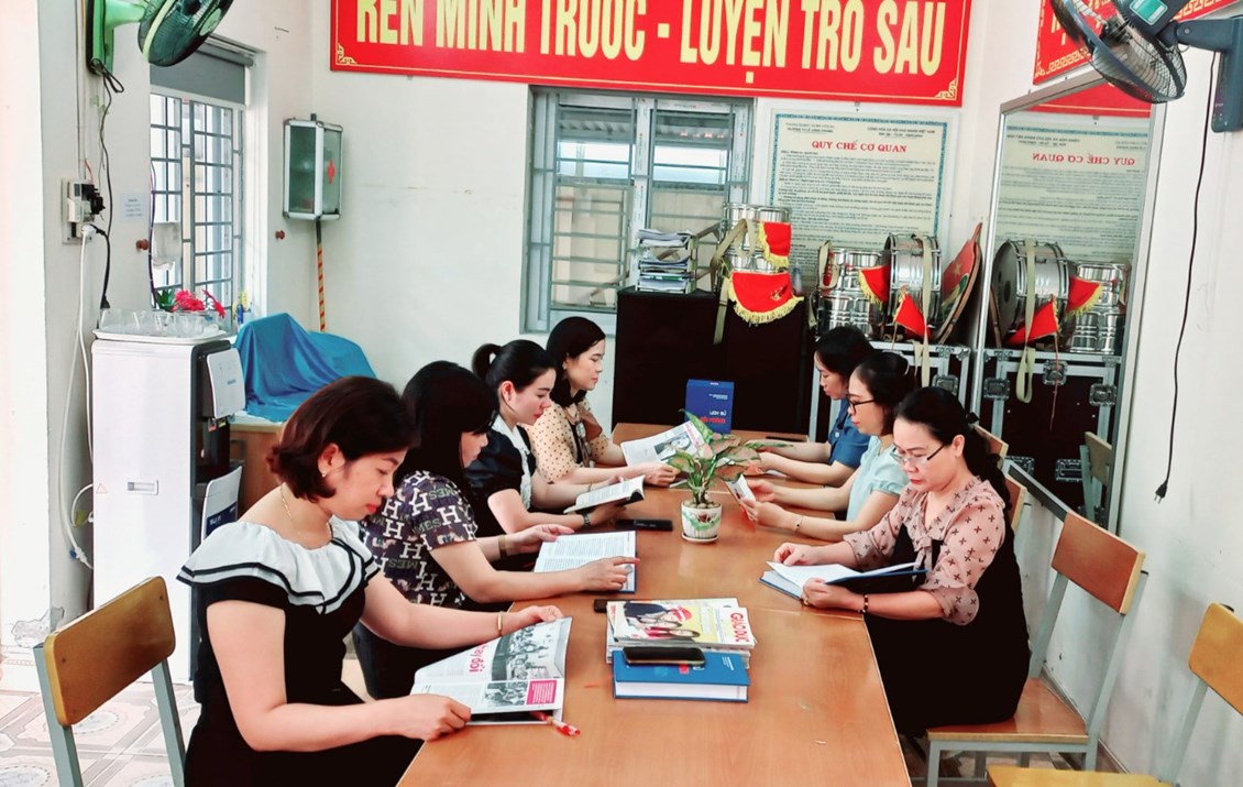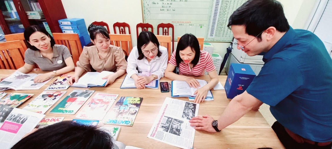 - Thầy giáo Lê Đức Năm- Chủ tịch Công đoàn- phó hiệu trưởng nhà trường tổ chức cho giáo viên các khối đọc và thảo luận bài viết “Hiệu quả từ dự án trường học kỹ thuật số” có trong báo Giáo dục thời đại.