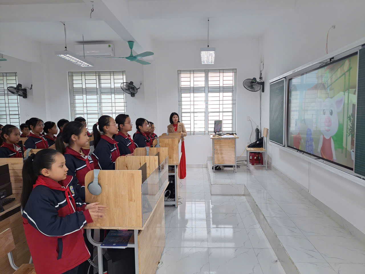 ☘️ Tiết học diễn ra sôi nổi, thân thiện. Ở phần khởi động, học sinh được hát và vận động theo video AI sinh động, tạo hứng thú trước khi bước vào hoạt động khám phá. Các em tích cực trao đổi, hợp tác nhóm và chủ động chia sẻ ý kiến. Học sinh được tìm hiểu, xác định các thành phần của từng tấm thiệp ứng với những dịp lễ trong năm, đồng thời biết lựa chọn công cụ phù hợp để tạo ra sản phẩm số thông qua các video AI sinh động, sát với nội dung bài học.