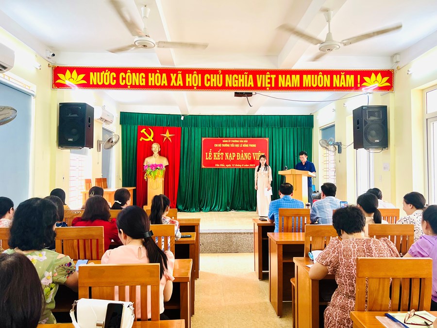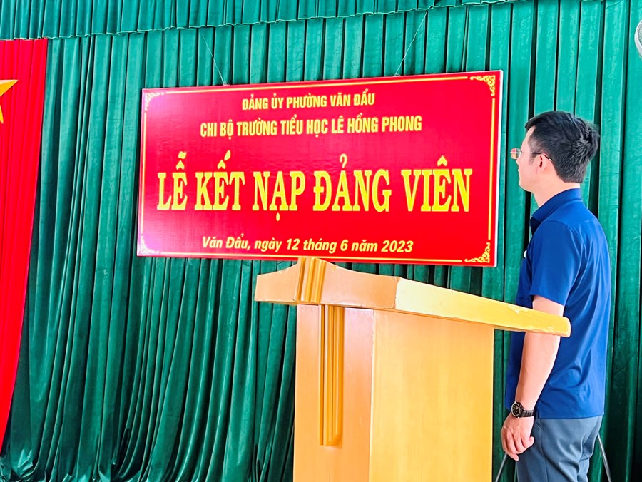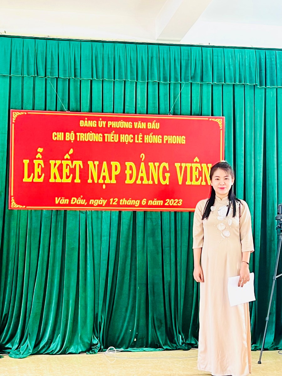 Căn cứ vào Điều lệ Đảng Cộng sản Việt Nam. Xét đơn xin vào đảng của quần chúng ưu tú Hoàng Ngọc Anh. Sáng ngày 12 tháng 6 năm 2023 Chi bộ trường Tiểu học Lê Hồng Phong đã tổ chức kết nạp cho quần chứng ưu tú Hoàng Ngọc Anh - Giáo viên trường Tiểu học Lê Hồng Phong vào Đảng Cộng sản Việt Nam.